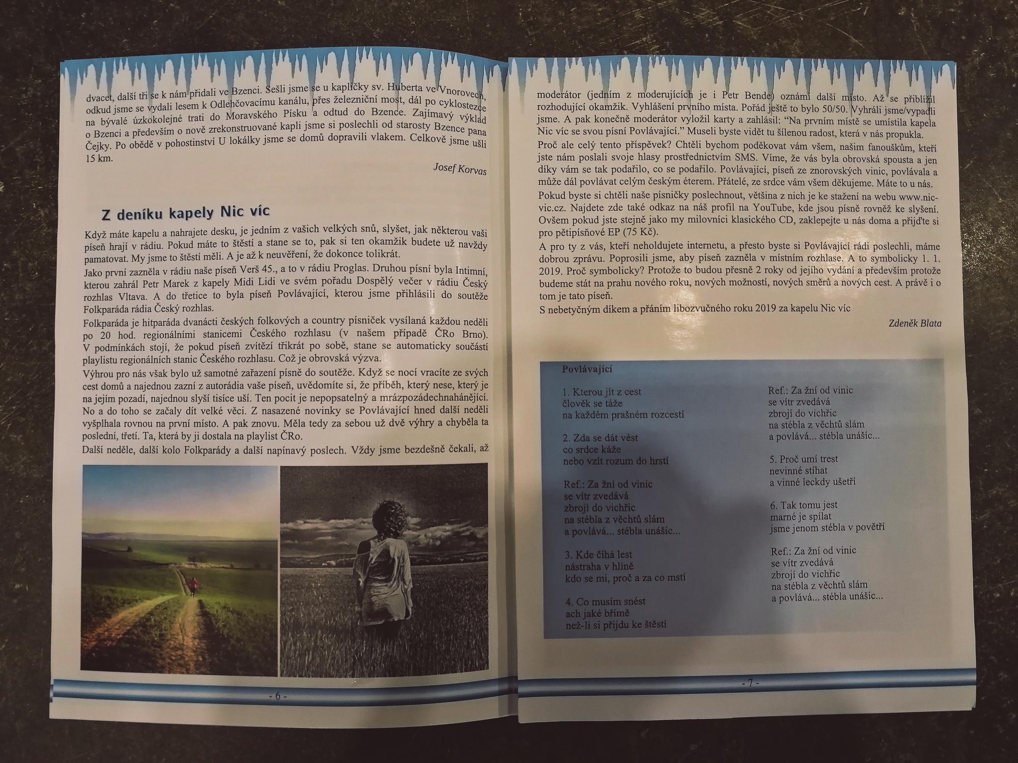 A pro ty z vás, kteří neholdujete internetu, a přesto byste si Povlávající rádi poslechli, máme dobrou zprávu. Poprosili jsme, aby píseň zazněla v místním rozhlase. A to symbolicky 1. 1. 2019. Proč symbolicky? Protože to budou přesně 2 roky od jejího vydání a především protože budeme stát na prahu nového roku, nových možností, nových směrů a nových cest. A právě i o tom je tato píseň.